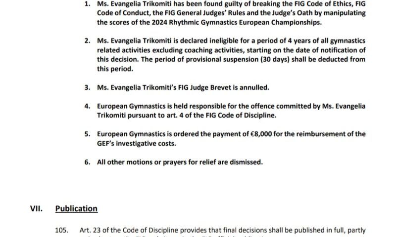 7 lutego 2025Komisja Dyscyplinarna Fundacji Etyki Gimnastyki uznała, że pani sędzia z Cypru Evangelia Trikomiti zmanipulowała przepisy sędziowskie podczas Mistrzostw Europy w 2024 roku i ukarała grzywną, zakazem działalności we wszystkich sportach gimnastycznych na okres 4 lat, a także anulowała licencję sędziowską.
